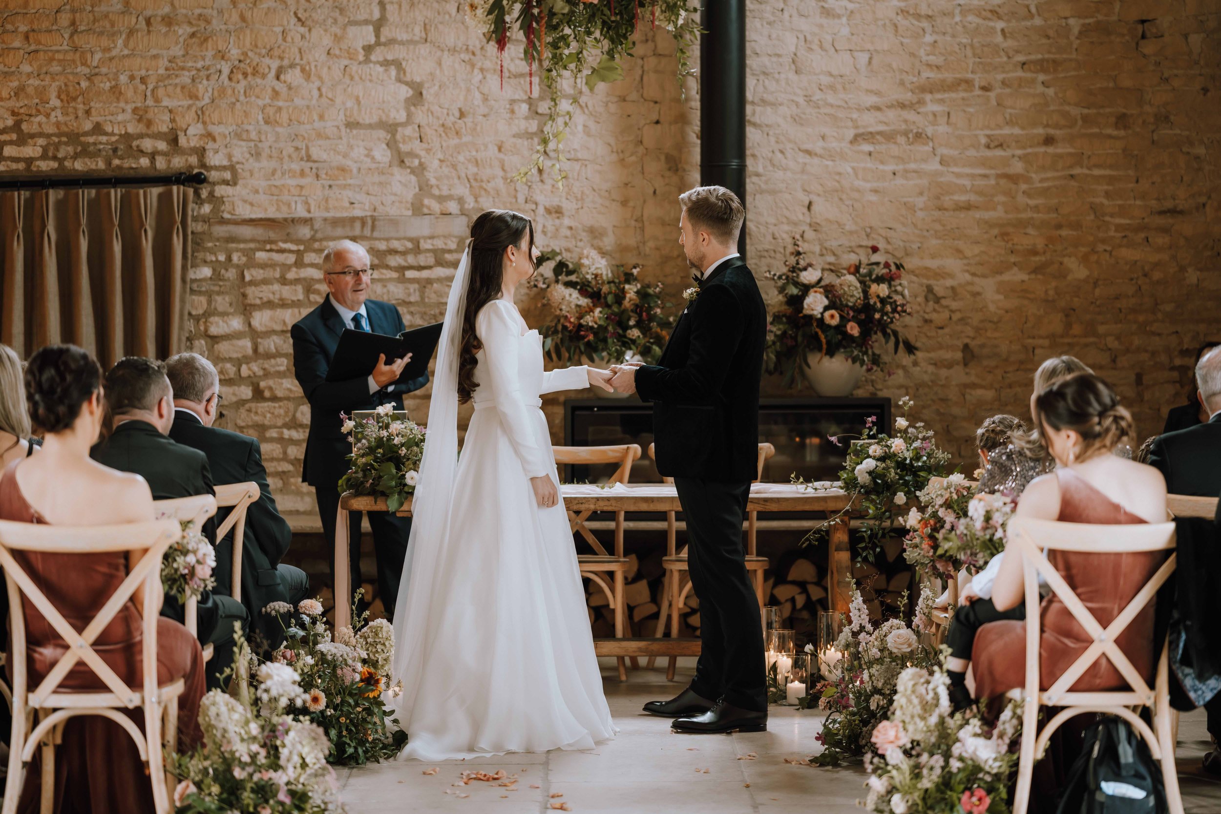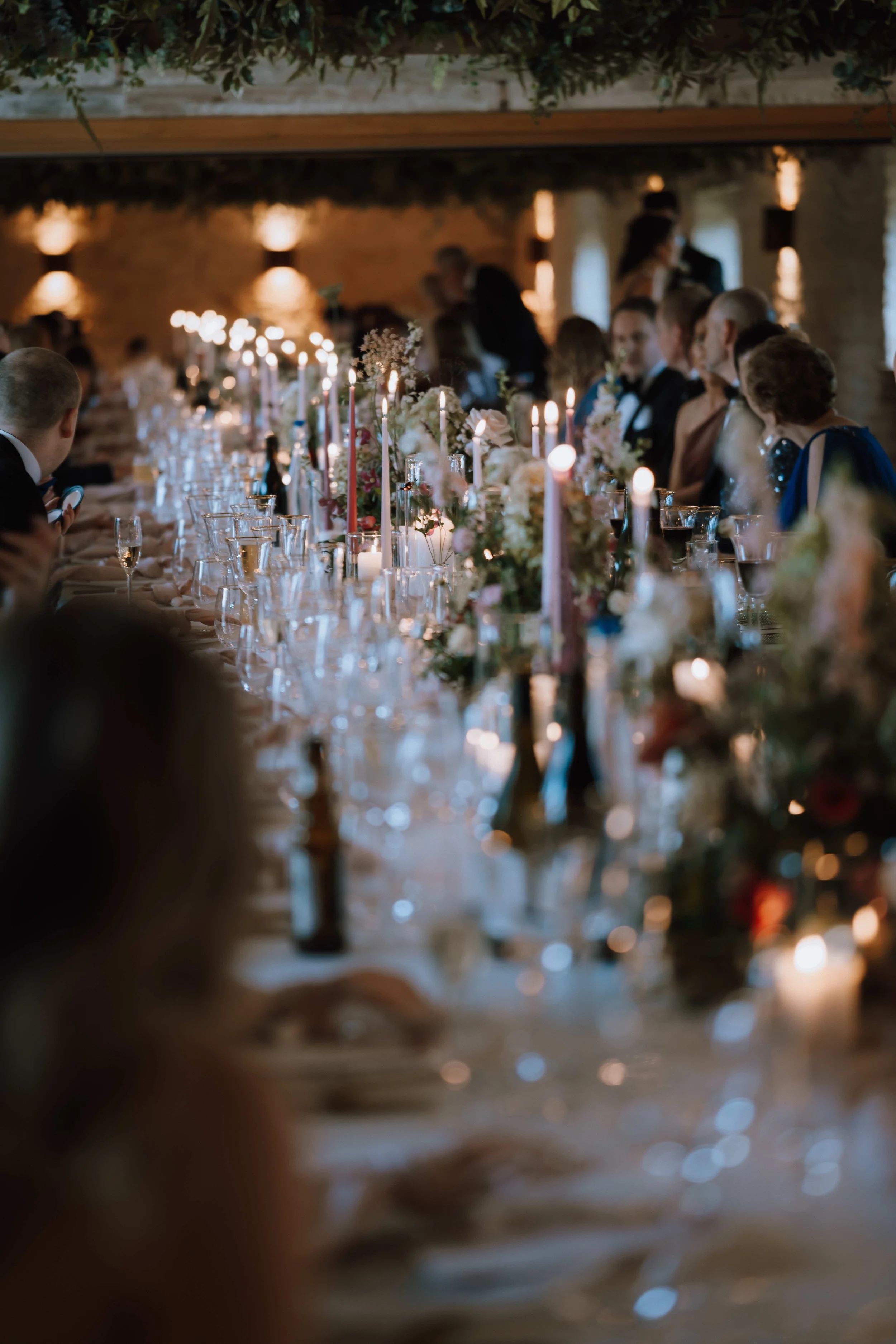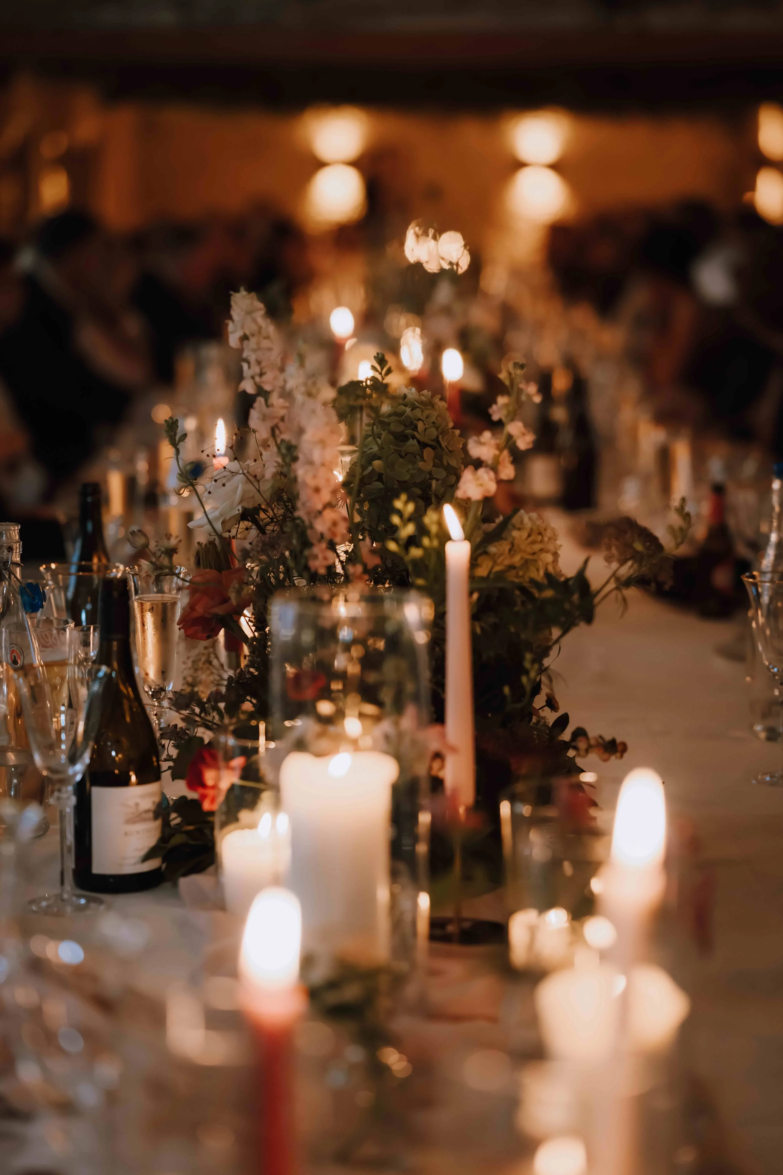 A fresh Autumn day at Old Gore by Yard Space provided the backdrop to Emily & Deans beautiful day. We included garden roses, zinnia, hydrangea, larkspur, clematis, and phlox, to name a few. Suspended arrangements in the main barn and an aisle of meadow arrangements framed their vows, with fresh rose petals scattered by their gorgeous girls. An asymmetrical installation framed their large banqueting table which was lined with dramatic arrangements and mixed vases amidst lots of gorgeous candlelight creating a cosy autumnal wedding breakfast. Their day was captured beautifully by Oobaloos.